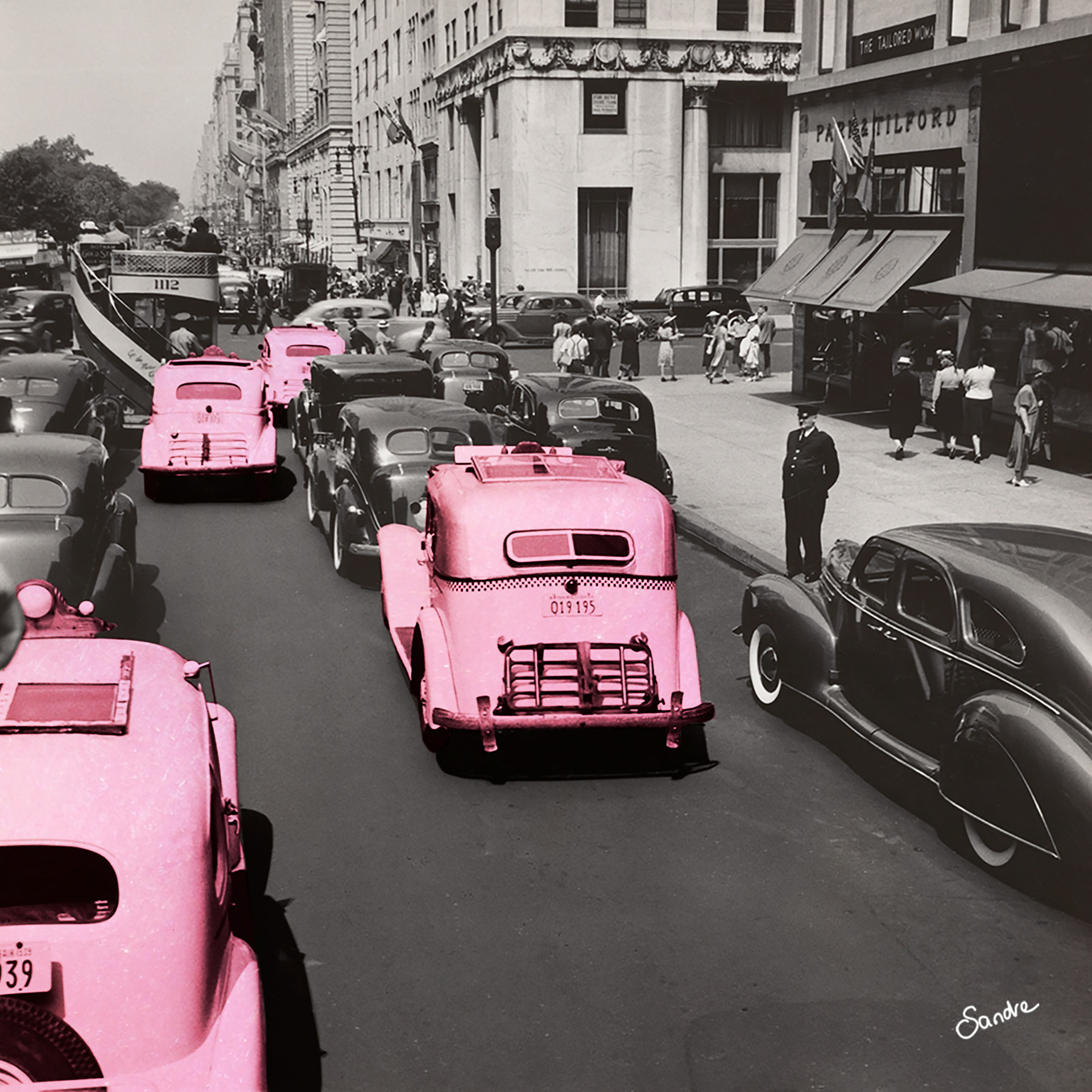 Il s'agit d'une rue de New York, dans laquelle quatre taxis texturés de barbe à papa viennent déstabiliser la circulation dense de véhicules sombres.